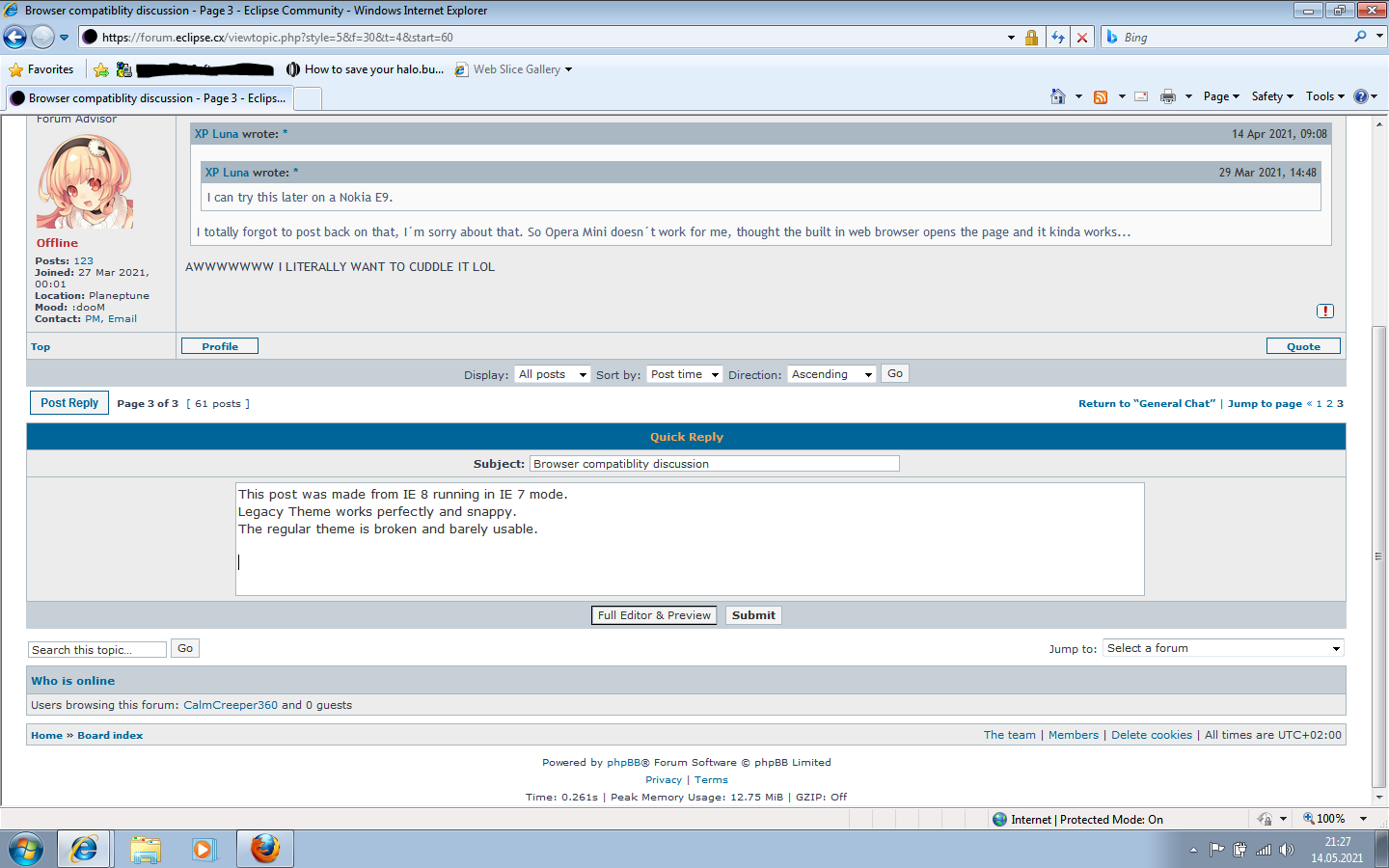 since everyone else like browse forums with fancy high end smartphones i though i might too. Nokia e90 communicator with latest firmware built in browser works with js off. i hope attachments works too. Aero is little buggy but classic works great. I am using pda screen under keypad to write since qwerty. Also ssl works with nnproject tls 1.2 patch for s60 3rd