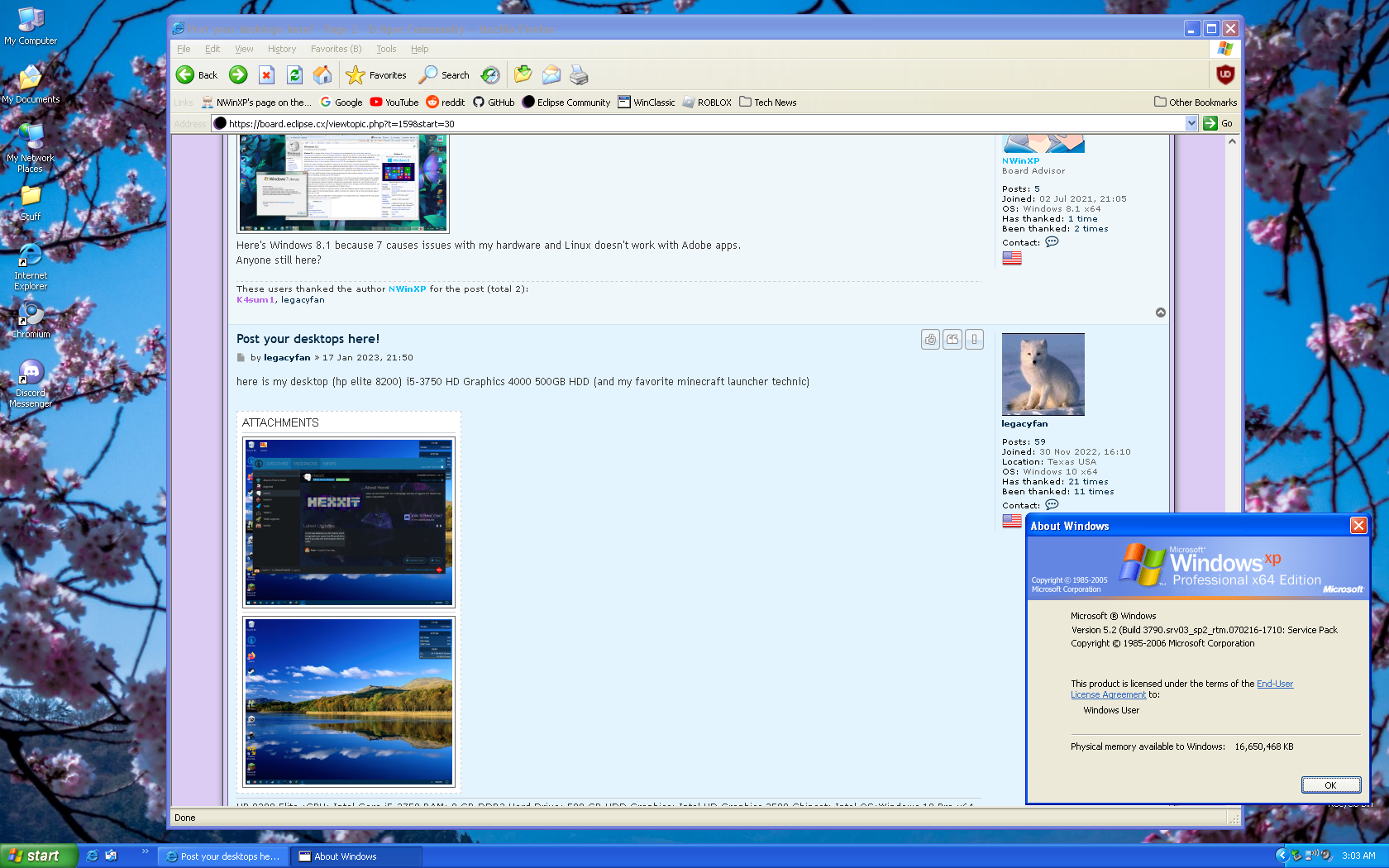 Here's my latest picture. Same laptop, but from the Windows XP portion. Only reason I am posting it is because I Print Screened it from a 55 Inch TV. Please click it to get the full 1920x1080 resolution.