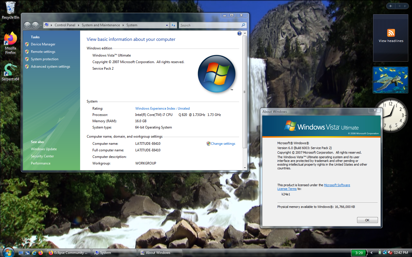 Vista Ultimate x64 on my main machine (Dell Latitude e5420).